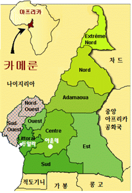 서부 아프리카에 위치한 카메룬은 북서쪽으로는 나이지리아, 동쪽으로는 차드와 중앙아프리카공화국, 남쪽으로는 콩고, 가봉, 적도기니와 국경을 마주하고 있다. 영어권 국가인 나이지리아와 아프리카 유일의 스페인어권 국가인 적도기니를 제외한 모두가 불어권 국가들이다. 카메룬은 과거 영국과 프랑스의 분할통치(1919-1960)에서 비롯된 영어권과 불어권의 경계를 그대로 유지하고 있다. 카메룬의 영토는 10개의 주(州)로 나뉘는데, 위의 지도 상에서 붉게 표시된 북서주와 남서주만이 영어권이고, 녹색으로 표시한 나머지 8개 주는 모두 불어권 지역이다. 행정수도인 야운데 시와 경제수도인 두알라 시는 모두 불어권 지역에 위치해 있다.